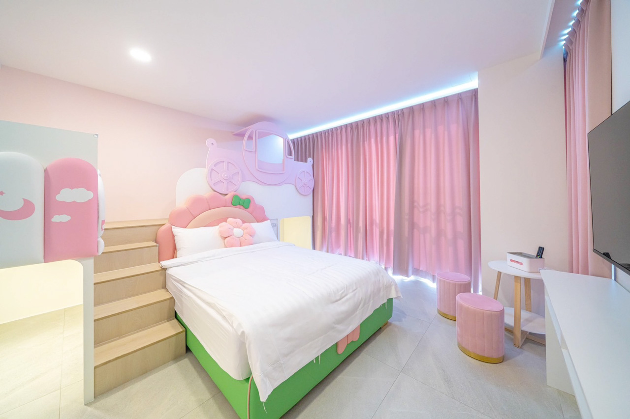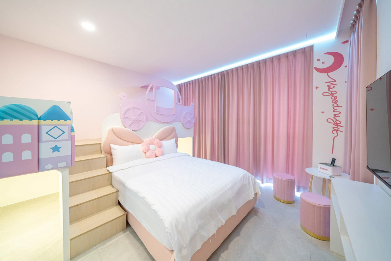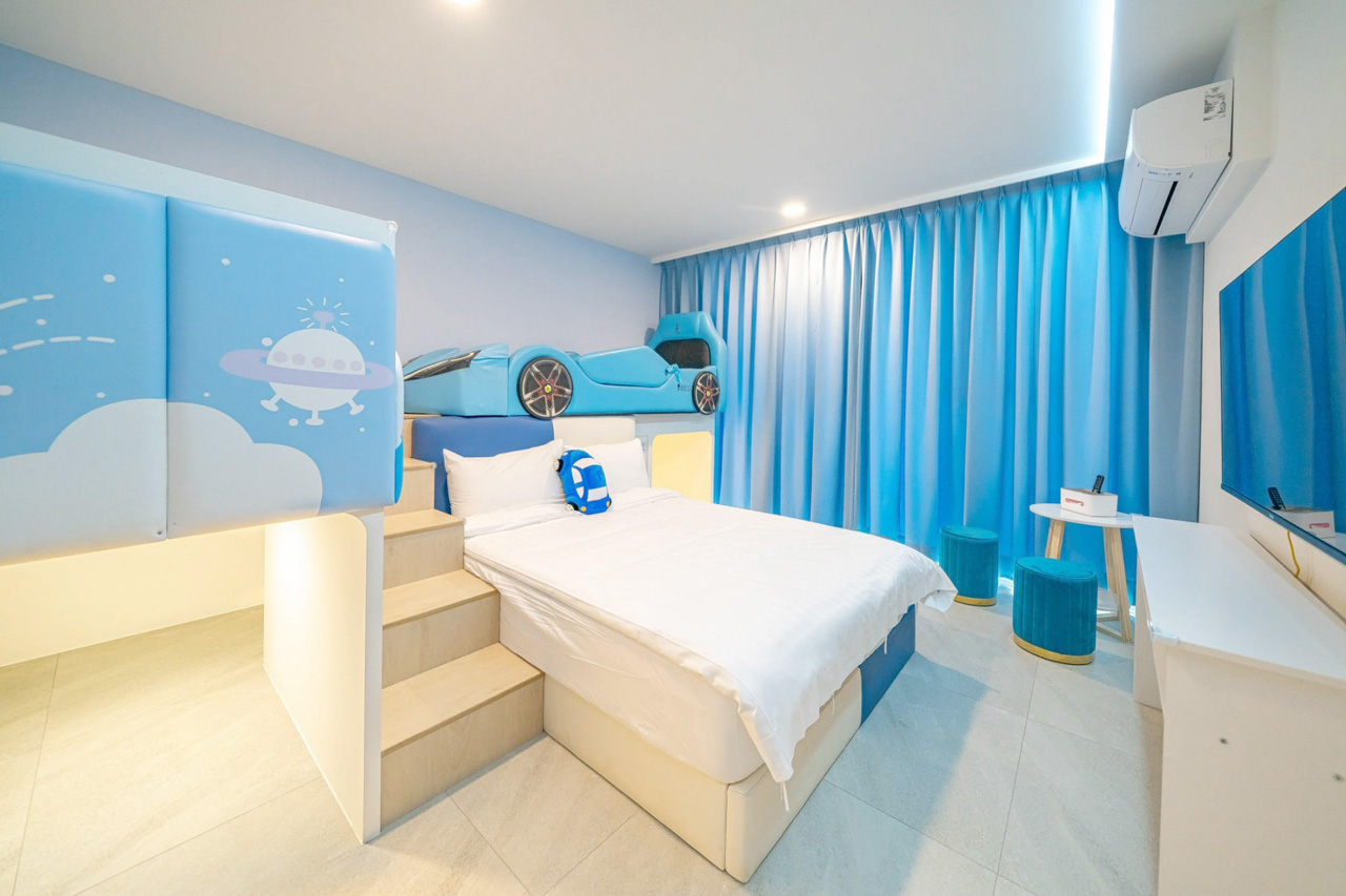 大客廳、視廳設備、專屬烤肉區、電動麻將桌、廚房開放使用、量身訂製軟包的大型溜滑梯 、switch、戲水池、兒童電動車、遊戲區、夜市免費彈珠檯⋯等等,及專為大小朋友打造有特色的賽車主題及公主系房間,酷炫又安全~